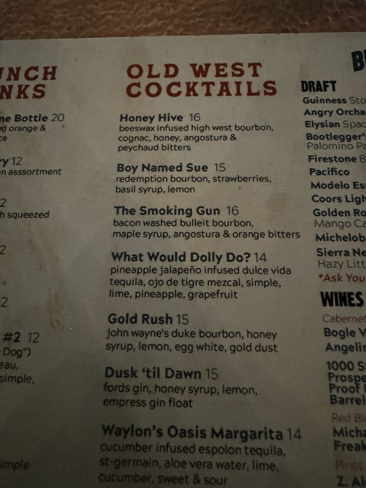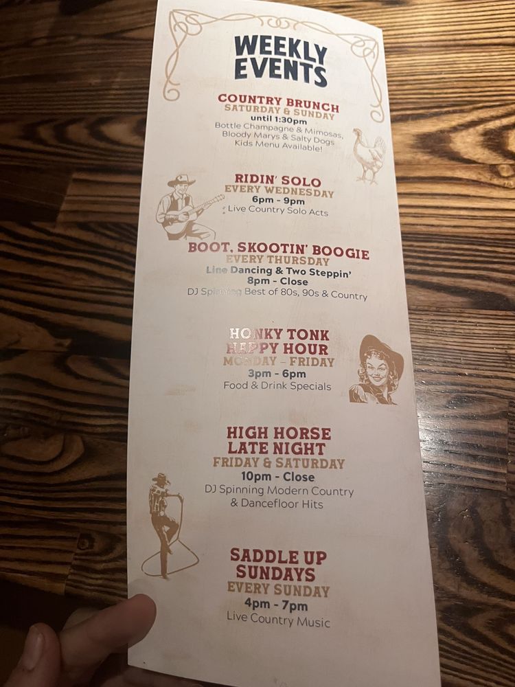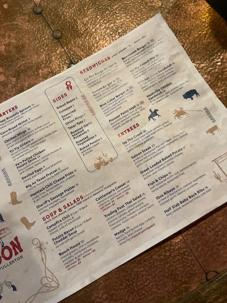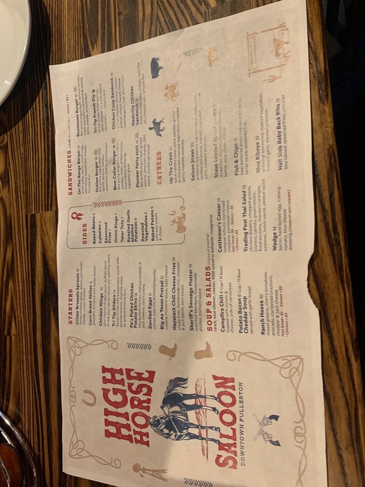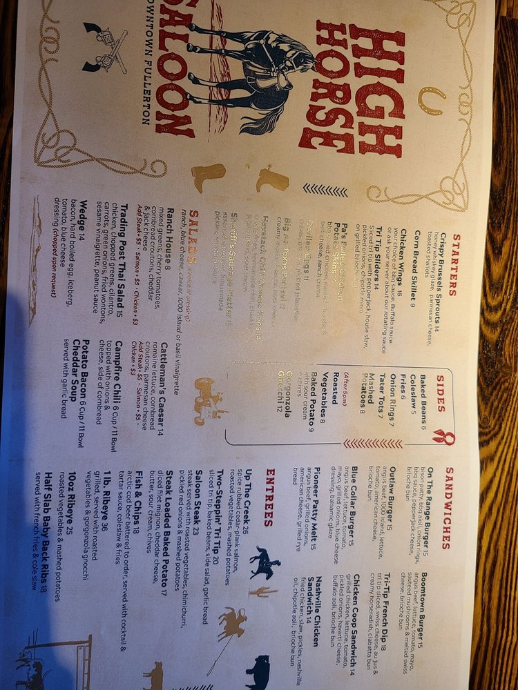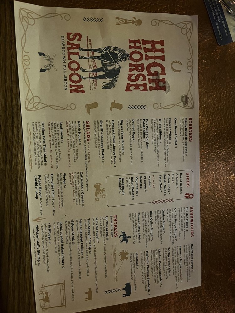 Introducing High Horse Saloon, a trendy American bar located in Fullerton, CA. With a Western-themed decor, this establishment offers a casual yet lively atmosphere. Known for their great happy hour specials and full bar, High Horse Saloon is perfect for a night out with friends or family. Customers rave about the delicious food options, including the cowboy steak, chili, cornbread, and mushroom burger. The drink menu is also impressive, featuring bourbon-based cocktails like The Smoking Gun and A Boy Named Sue. With attentive service and a spacious dance floor on weekends, High Horse Saloon is a go-to spot for drinks and dancing. Don't miss out on their Nashville Hot Chicken sandwich or French dip during their family-friendly Sunday brunch.Visit for an authentic Wild West experience with delicious food and drinks.
